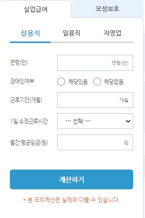 만약 자격조건에 해당이 된다면 내가 받을 수 있는 실업급여는 얼마나 되는지 모의계산해보시기 바랍니다.